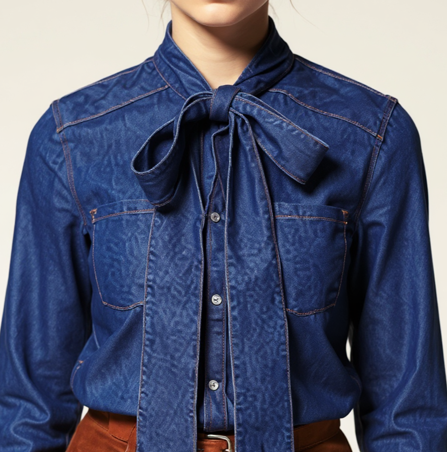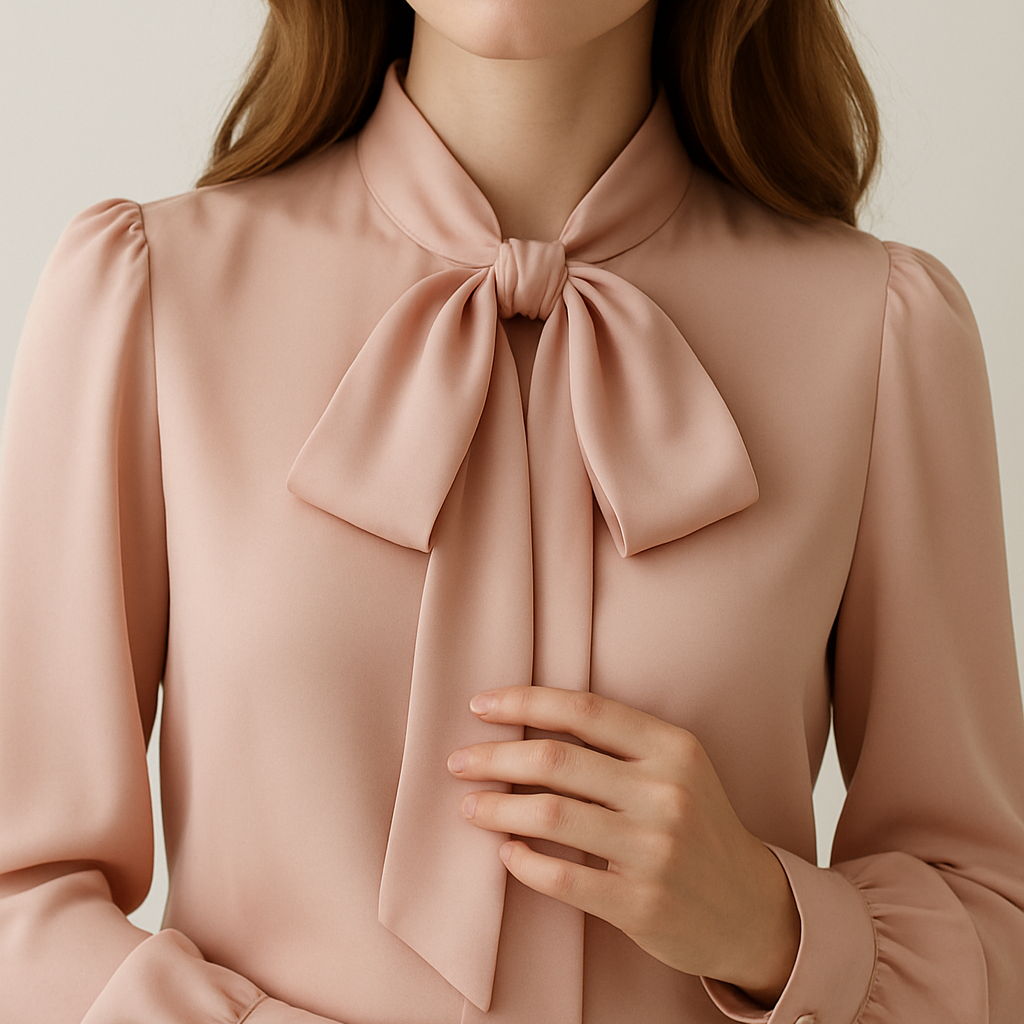 Воротник-бант — это один из самых женственных и выразительных элементов в швейных изделиях. Он представляет собой аккуратную стойку, переходящую в длинные ленты, которые завязываются спереди в воздушный, пышный бант. Такой воротник моментально добавляет образу утончённости: будь то блузка, платье или лёгкая рубашка.